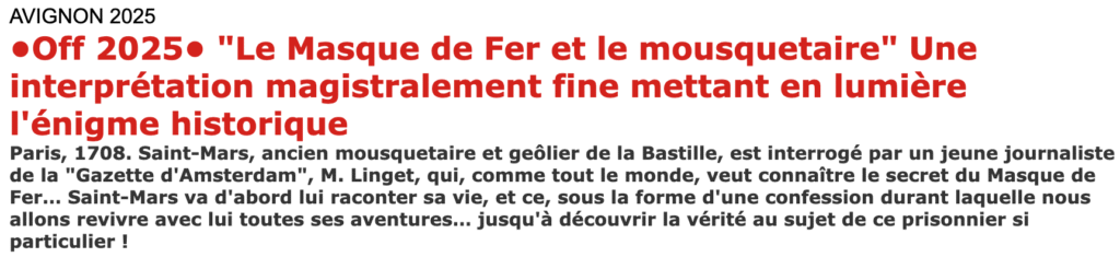 …pour découvrir la vérité sur le Masque de Fer à Avignon au théâtre l’Autre Carnot